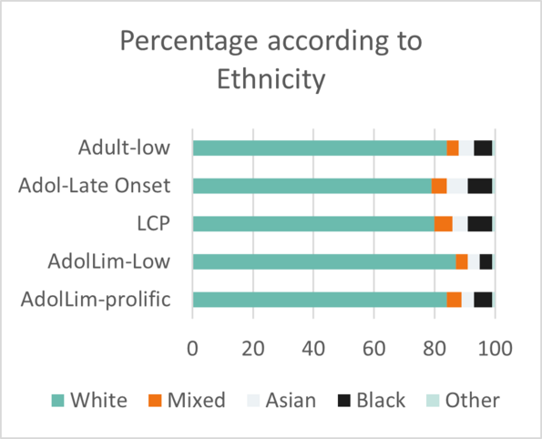 The research also found higher proportions of individuals from Black ethnic backgrounds in the LCP and Adol-Late Onset trajectories. There were proportionally more females in the AdolLim-Low trajectory compared to the others. Approximately one-third of all individuals in this analysis had been excluded from school prior to their first involvement with the criminal justice system. However, for individuals in the AdolLim-Low trajectory, this was only around 25%.