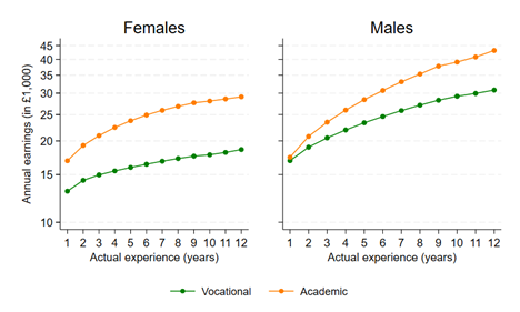 Figure 1 plots the evolution of average annual earnings of young workers who acquired academic or vocational education, as they accumulate years of experience in the labour market, separately by gender. In defining the starting line, this measure of experience considers when individuals completed their studies (often later for academic students who are more likely to progress to Higher Education) to avoid capturing students who were still in part-time student jobs. The figure reveals that academic-educated female workers benefit from higher earnings right from the start, with the gap increasing considerably as their earnings grow faster with experience than for vocational-educated females. For males, earnings are initially comparable between the two groups, but earnings growth of vocational-educated young workers is soon outpaced. After 12 years of work experience, academic-educated workers earn approximately 10 to 12 thousand pounds more than their vocational counterpart.